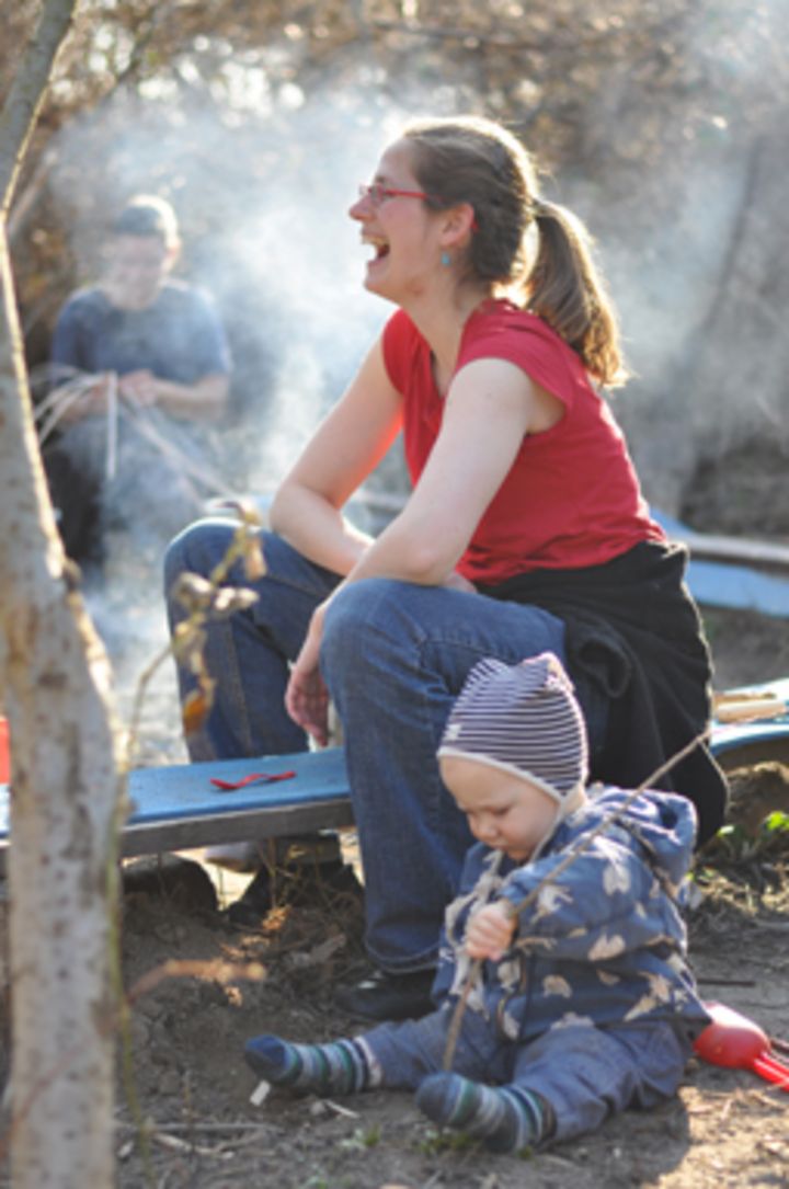 Draußen sein … klettern … matschen … rennen … spielen … Die Natur mit allen Sinnen erfassen – das können die Kinder beim freien Spiel. Die Eltern werden beim Sägen, Feuer- machen, Stockbrotteigkneten und -backen helfen, sodass die Kinder diese Tätigkeit nachahmend erleben können. Den Rahmen bilden – der Jahreszeit entsprechend – kleine Liedchen, Handgestenspiele und Reigen, die auch Anregungen zur Gestaltung von Festen und Ritualen zu Hause geben können.